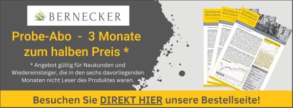 Dann haben Sie hier die Möglichkeit! Sichern Sie sich die aktuelle Ausgabe des FRANKFURTER BÖRSENBRIEFES im Einzelabruf oder unser Probe-Abo mit einem Rabatt von 50 % in den ersten 3 Monaten, mit einem Klick HIER oder auf das untenstehende Bannerbild.